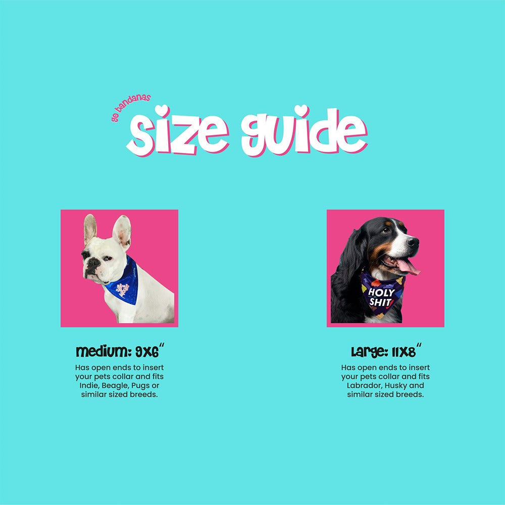 Ab pets bhi karenge Mumbai ko cheer because IPL season is here. Elevate your game, honey. You gotta get your pet a Reversible Go Bandana from the 'Indian Pet League' Collection. Made of high-quality polyester-satin that looks super classy on your pet, and the print is so darn cute you won't be able to resist taking a million pictures of your furry friend wearing it. It's the perfect jersey for your furry's Game-Day outfit, and it'll show everyone around you that you're a true cricket fan. The Bandana comes with an open end in Medium & Large Size, that you can insert your pets collar in easily. Please refer to the size chart for details. Please place your orders here and we will contact you for the size option. For Small Size, you can send us a DM on Instagram! Now, if you'll excuse us, we've got some cheering to do. Go #Mumbai 💙💙