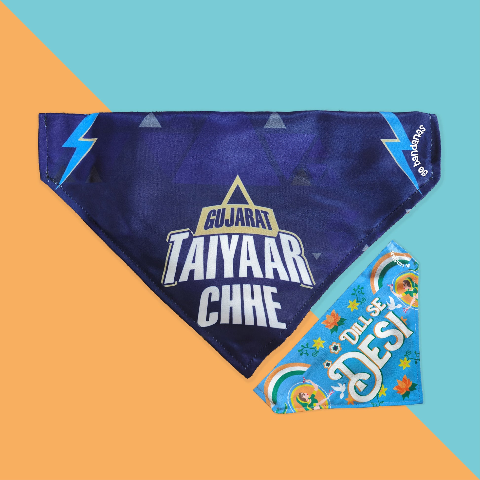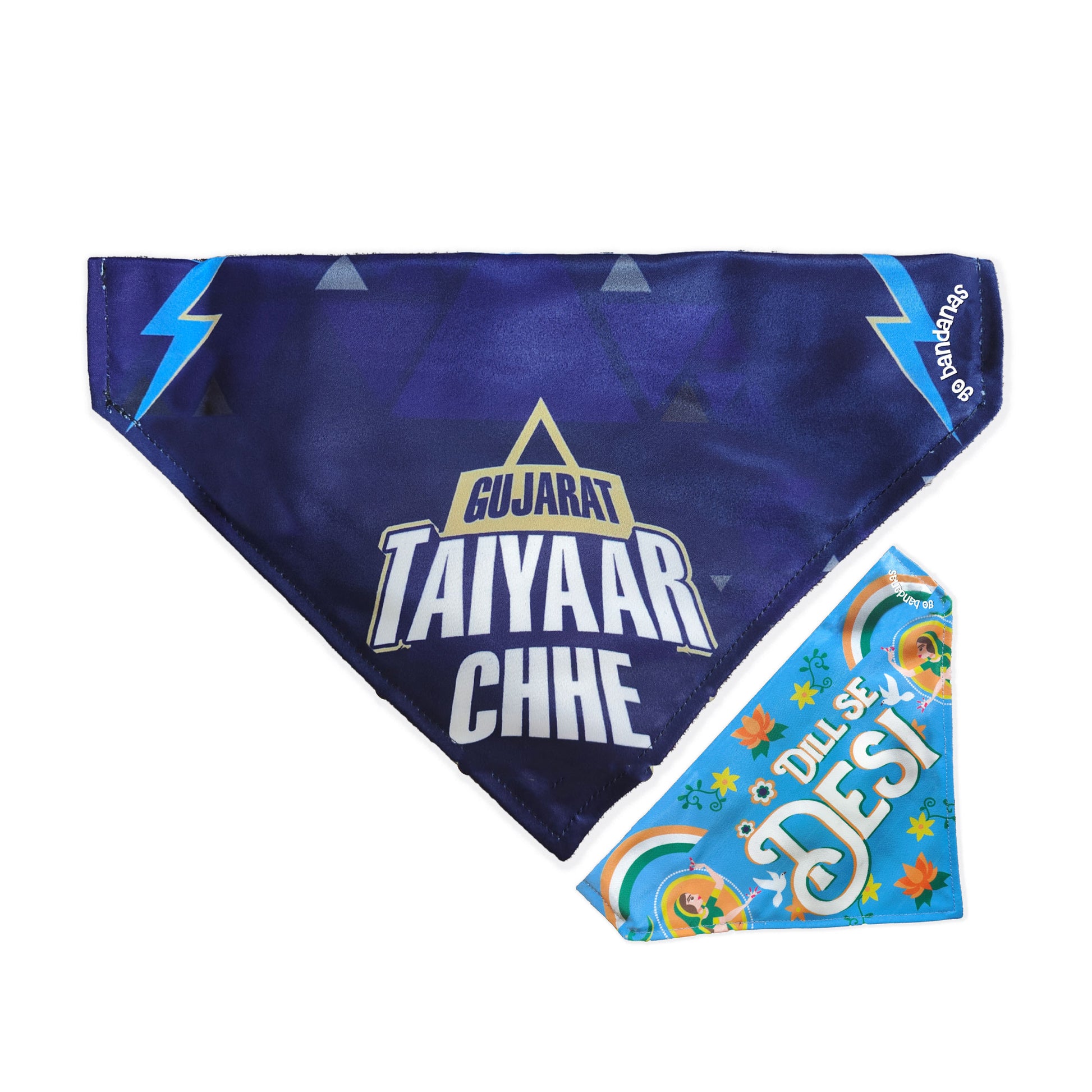 Go Bandanas Reversible Indian Pet League (IPL) Gujarat Taiyaar Chhe (Blue) & Dill Se Desi (Multi Colour) Bandana for Pet Dogs & Cats