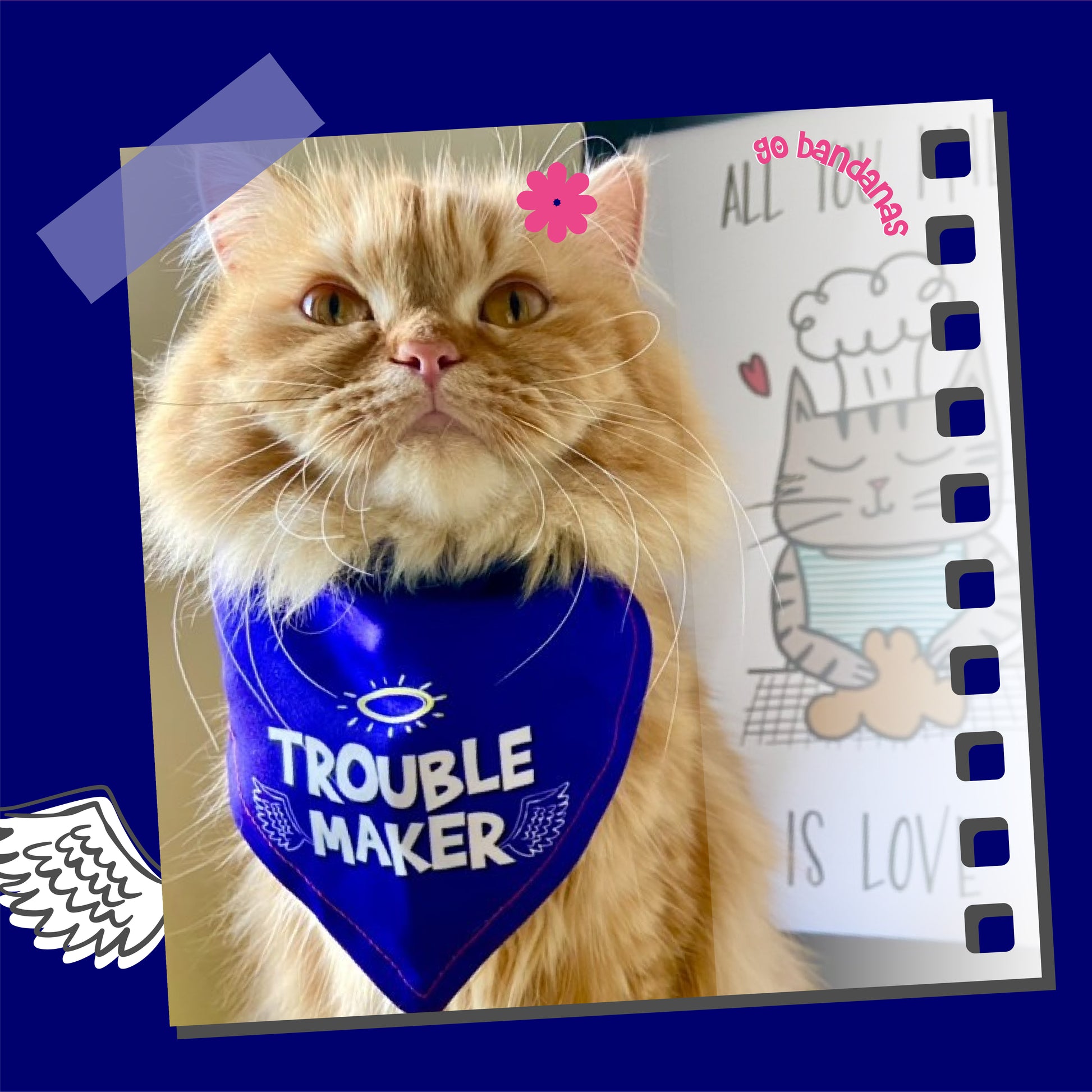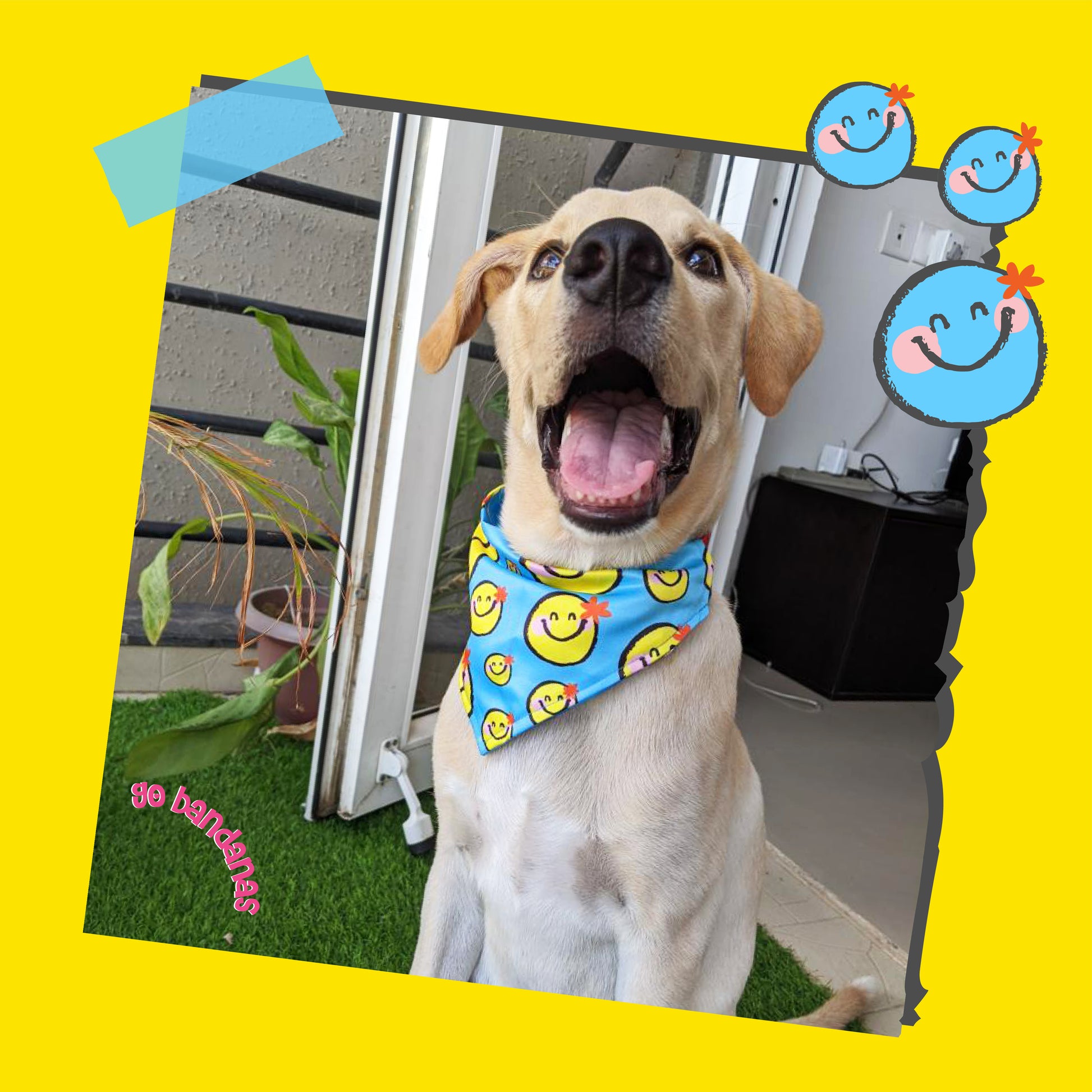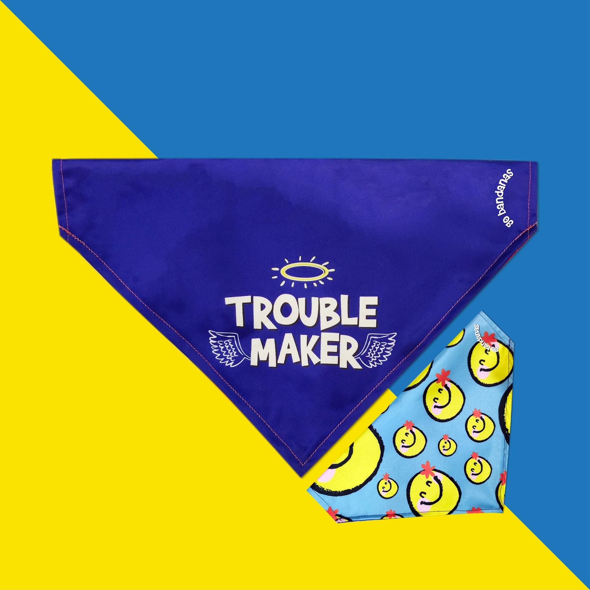 Go Bandanas Reversible Trouble Maker (Blue) & Contagious Smile (Yellow) Adjustable Bandana for Pet Dogs & Cats